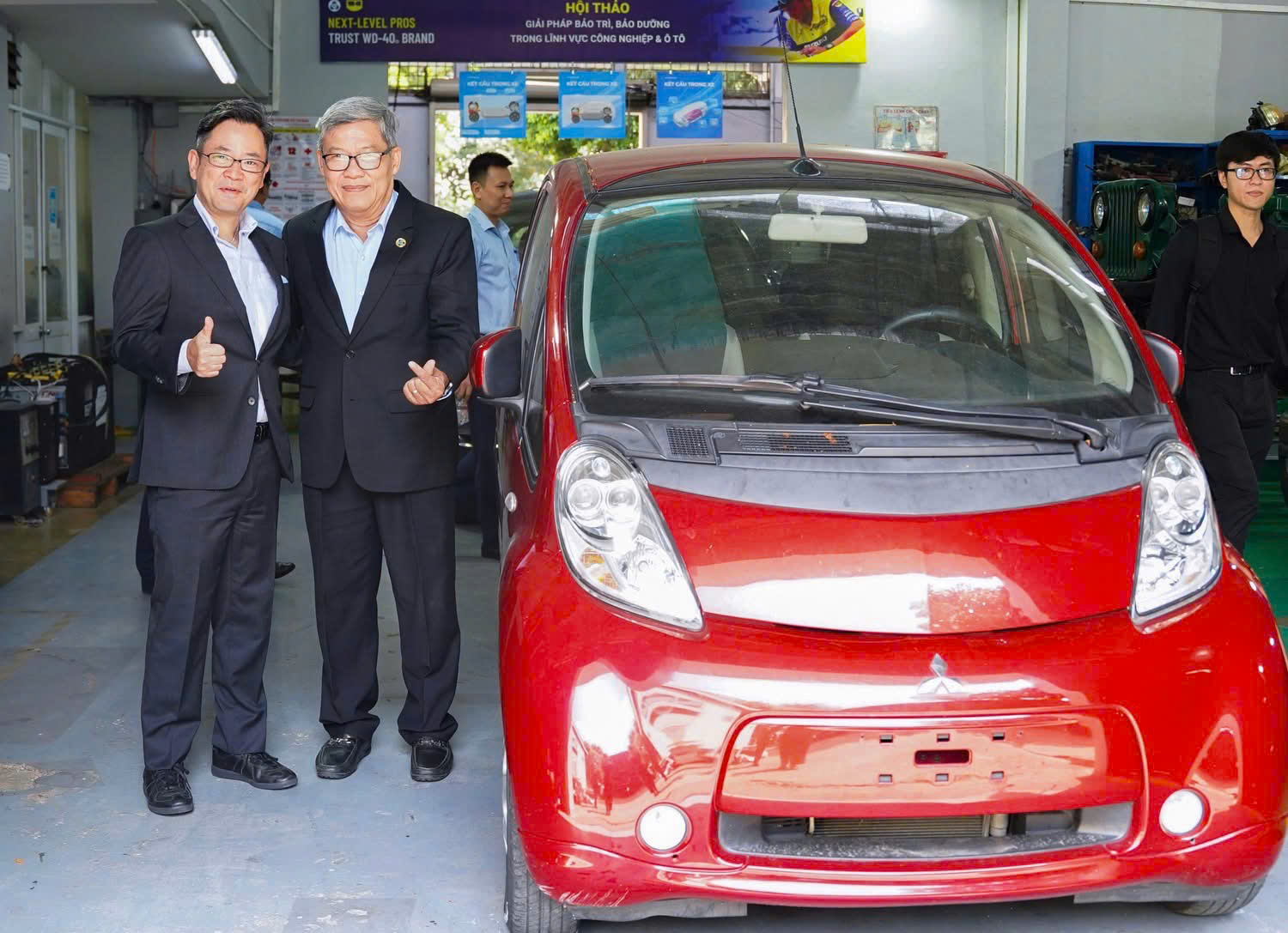Các đại biểu tham quan xưởng thực hành ô tô. Trong hình là xe ô tô điện I-MIEV được Mitsubishi Motors Việt Nam tài trợ năm 2024.