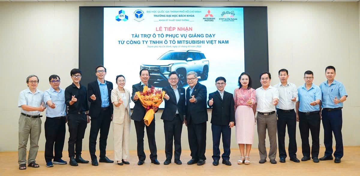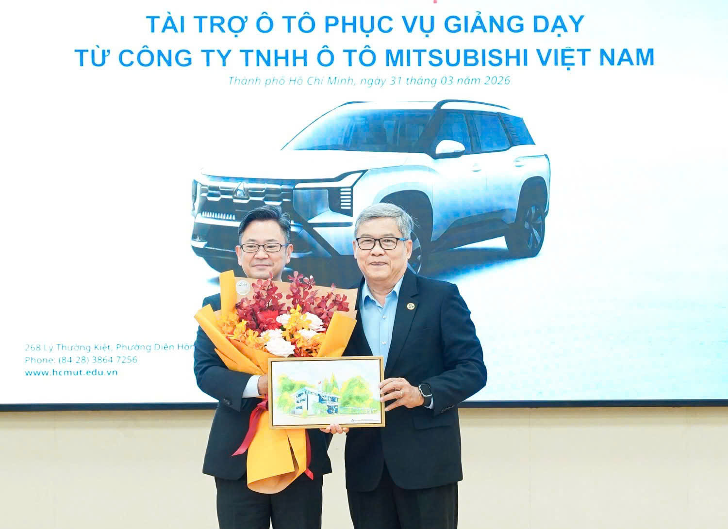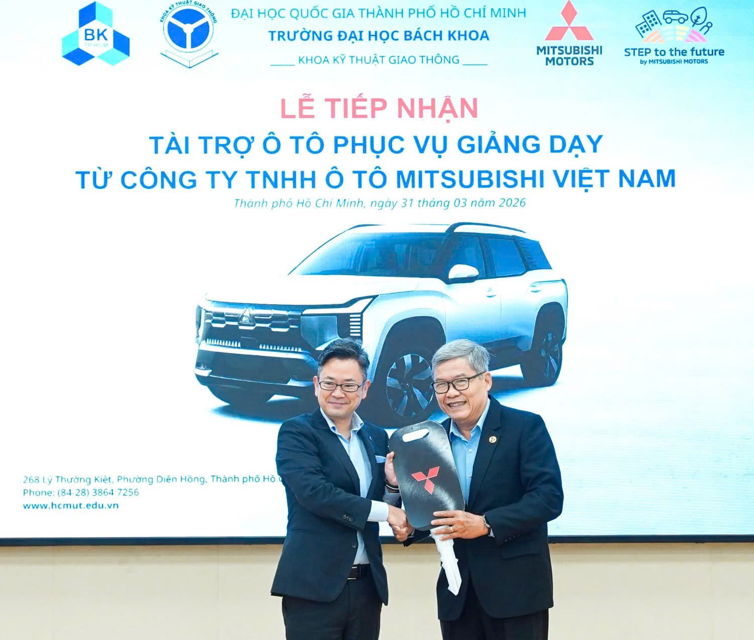 Buổi lễ tiếp nhận tài trợ diễn ra vào sáng ngày 31/3/2026, có sự hiện diện của ông Watanabe Kazuhiro - Phó Tổng Giám đốc Công ty TNHH Ô tô Mitsubishi Việt Nam; ông Đặng Trần Thế Hiển - Phó Tổng Giám đốc NPP Nam Auto; PGS. TS. Trần Thiên Phúc - Phó Hiệu trưởng Nhà trường cùng các đại diện của doanh nghiệp, quý thầy, cô và các bạn sinh viên.